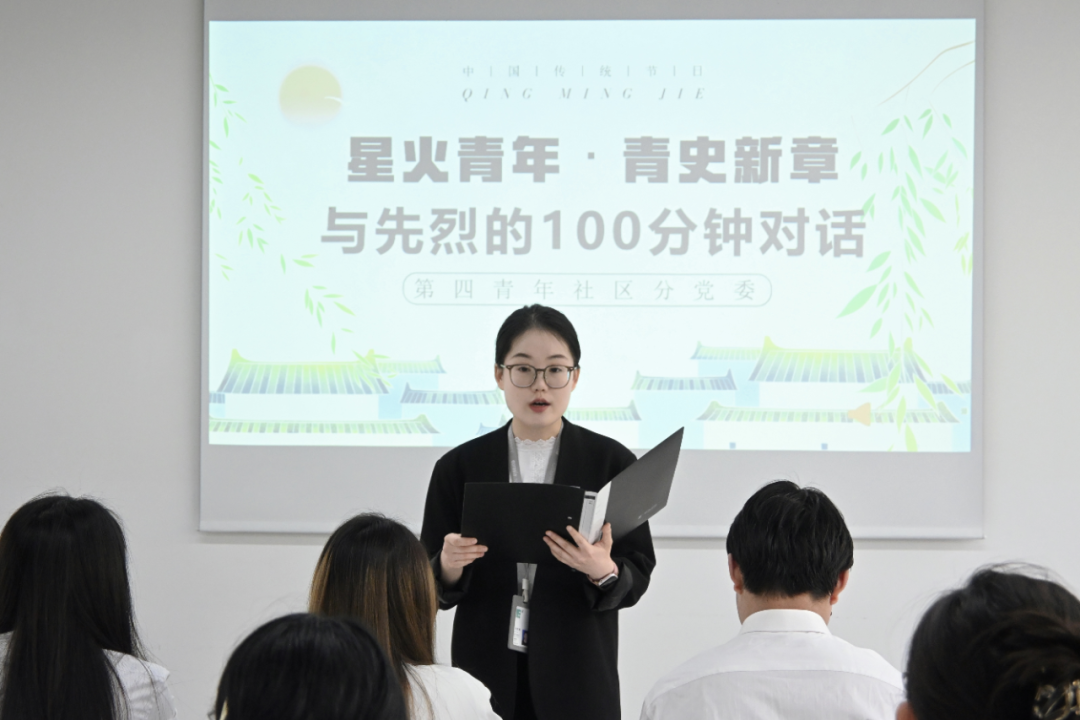 清明节来临之际,第四青年社区分党委开展“与烈士的100分钟对话”主题党日活动。活动以缅怀英烈为核心,旨在厚植当代青年大学生的爱国情怀,引导他们铭记历史、砥砺前行。活动开始,学生第五党支部委员刘妍姬指出,中国式现代化是物质文明和精神文明相协调的成果,将英烈精神融入中国式现代化的伟大实践,为实现第二个百年奋斗目标凝聚力量。她希望在场同学铭记烈士精神,努力学习,为中华民族伟大复兴贡献青春力量。接着,大家一同观看了革命先烈的英勇事迹,...