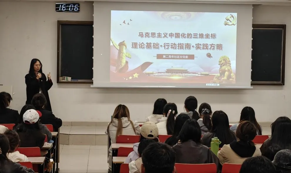为持续深化理论武装,引导青年党员深刻把握马克思主义中国化时代化的精髓要义,第二青年社区分党委于11月5日下午16:00在北C-308教室,组织开展了“马克思主义中国化的三维坐标:理论基础·行动指南·实践方略”专题党课,由王怡同志担任主讲,98名入党积极分子参与现场学习。王怡老师系统阐述了马克思主义中国化的内在逻辑与时代价值。课程围绕“三维坐标”展开,深入讲解了马克思主义基本原理作为理论基础的源头作用,梳理了其中国化成果作为引领事业发展的行动指南的伟大,...
