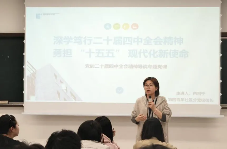 2025年11月4日晚,第四青年社区分党委白利宁同志于北B-109为入党积极分子讲授第一课,将"深学笃行二十届四中全会精神"的政治要求,转化为欧亚青年"为何学、学什么、怎么干"的行动指南。课程紧紧围绕“领会历史方位、把握战略部署、理解实践基础、明确未来目标”四个层面展开,深入浅出地解析了“十五五”规划建议与青年学生的关联。白老师引导学员们思考如何将国家的发展蓝图,转化为自身在职业规划和志愿服务中的具体方向与实际行动。...