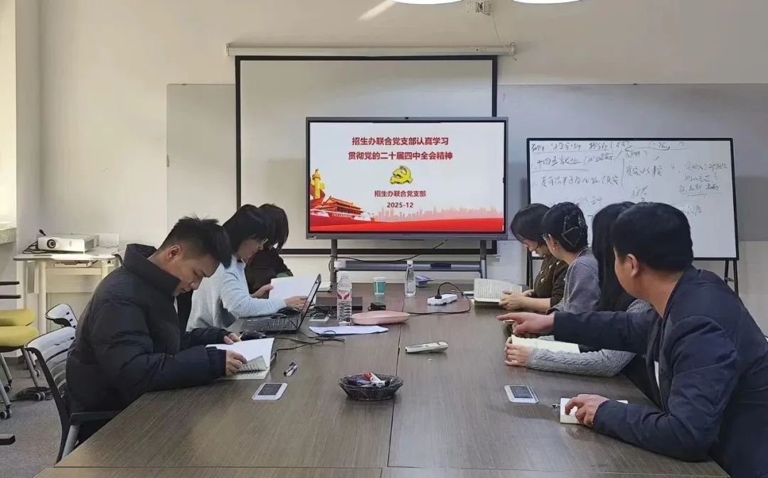 为深刻领会、准确把握党中央最新决策部署与精神实质,12月25日上午,招生办联合党支部组织全体党员召开专题学习会,集中学习贯彻党的二十届四中全会精神。本次学习聚焦全会审议通过的《建议》及其核心内涵,旨在统一思想、凝聚共识、明确方向,为推动新时代学校招生工作高质量发展筑牢思想根基。通过学习,全体党员进一步深化了对党的二十届四中全会重大意义的认识。大家一致认为,全会是在我国迈上全面建设社会主义现代化国家新征程、...