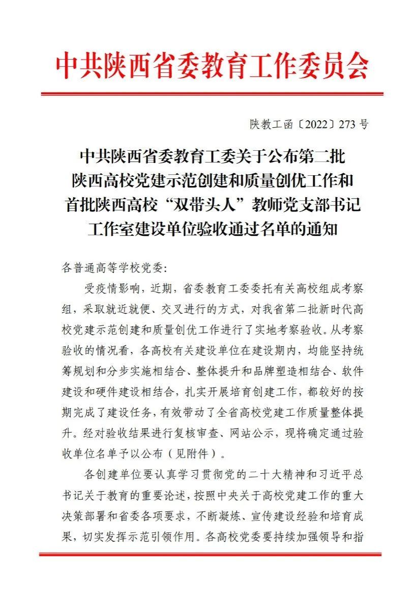近日,中共陕西省委教育工委发布《关于公布第二批陕西高校党建示范创建和质量创优工作和首批陕西高校“双带头人”教师党支部书记工作室建设单位验收通过名单的通知》,KY开元后勤集团第二党支部和第三青年社区第一学生党支部分别通过了“全国党建工作样板支部”和“全省党建工作样板支部”验收。学校后勤集团第二党支部围绕“七个有力”目标,以党政融合与协同创新为抓手,充分发挥党支部战斗堡垒作用,以提升组织力为重点,着力发挥政治引领,...