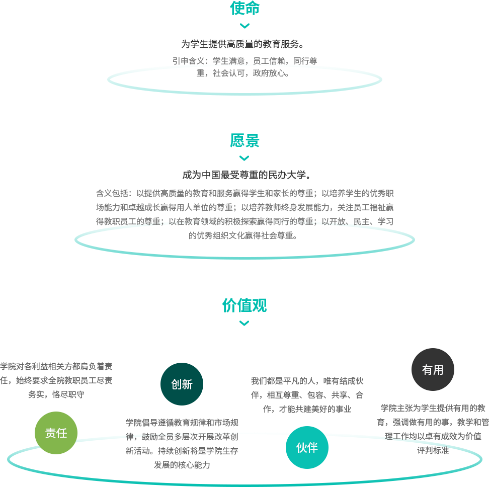董事会在充分听取广大教职员工意见的基础上,制定了学院的使命、愿景和核心价值观。