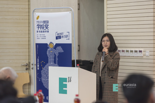 承办单位广告人文化集团市场部代表陈紫雯女士为在场同学们介绍学院奖的奖项设置,讲解参赛策略。随后,为感谢我院一直以来组织大赛的辛苦付出,组委会为文化传媒学院颁发“年度广告教育推动奖”证书,鼓励我院继续努力推动大赛发展。
