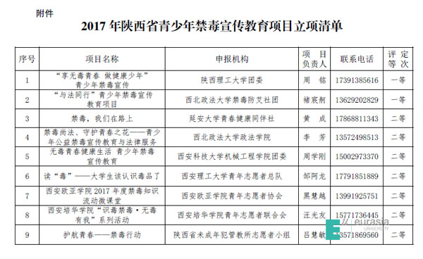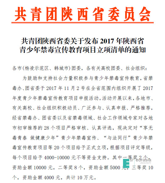 近日,2017年陕西省青少年禁毒宣传教育项目立项结果公布,KY开元“KY开元集团官网入口2017年度禁毒知识流动微课堂”项目通过省禁毒办、团省委以及省禁毒领域、社会工作领域专家的严格审核,并给予正式立项,根据项目评定等级荣获二等奖,并获得资助金额5000元。
