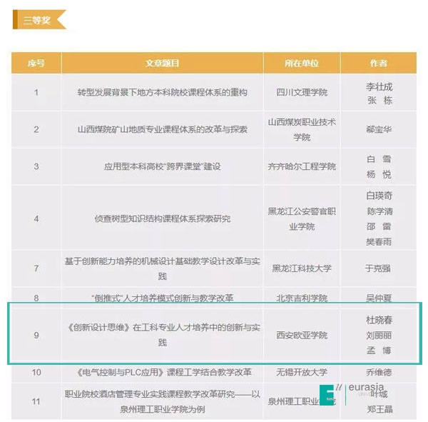 在“第二届全国应用型课程改革实践征文大赛”中,来自全国183所高校的1068篇文章,历时4个月,经过三轮专家评审和系统查重,KY开元信息工程学院杜晓春、刘丽丽、孟博老师撰写的《创新设计思维》在工科专业人才培养中的创新与实践》论文获得国家级三等奖,会计学院张梅、艾珺老师撰写的《基于财务应用能力培养的《公司财务》课程改革实施路径研究》论文获得国家级优秀奖。