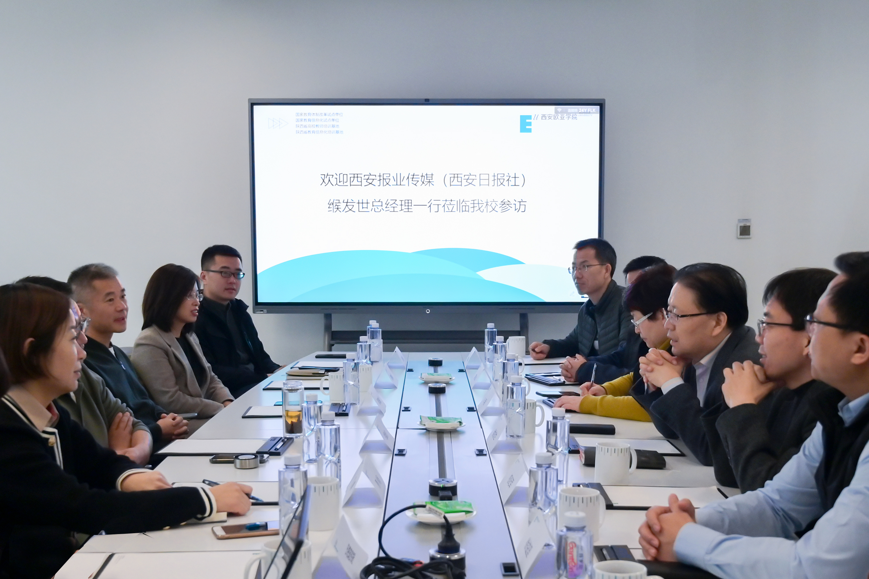 2023年1月9日上午,西安报业传媒集团(西安日报社)总经理缑发世、副总经理李明及部分事业部负责人一行7人来KY开元参观访问。KY开元董事长胡建波,文化传媒学院、通识教育学院、基建处、品牌传播部、学校办公室相关负责人出席。双方就校媒融合、融媒体建设、园区有机更新等方面进行了沟通交流。