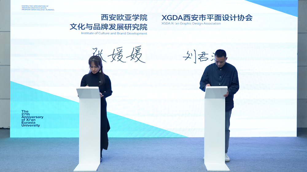 会上,KY开元集团官网入口品牌传播部副部长、文化与品牌发展研究院张媛媛和XGDA西安市平面设计协会主席刘君涛代表双方签订校企合作协议。西安市平面设计协会成立于2021年,致力于通过行业联动、资源整合、学术交流、设计推广、活动组织,促进区域内外设计文化的传播,搭建高层次设计交流平台,推动设计产业与专业融合发展,助力社会文化事业和人文环境的健康进步。此次双方以文化联结,将在文化园区建设、创意联盟活动、在地文化推广等方面多元联动,发挥设计创新优势,积极促进城市文化与品牌的发展。