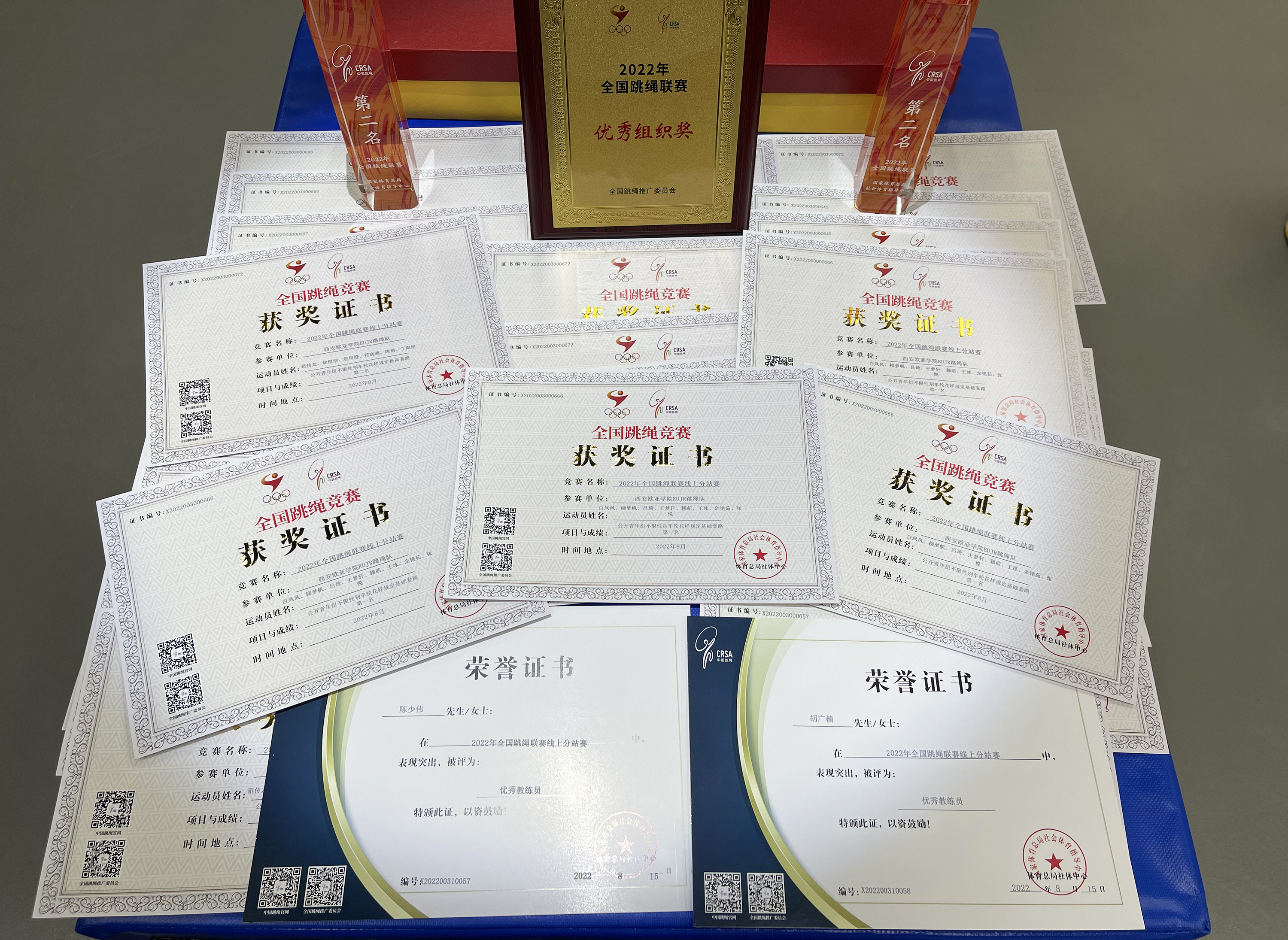 跳绳作为大众体育热门项目,在当前疫情防控常态化形势下,为贯彻落实《全民健身计划(2021-2025年)》,本次比赛打破时空限制,于6月9日至8月25日以线上赛的方式举办。EUJR跳绳队克服赛程长、气温高的考验,以别出心裁的编排和精妙默契的配合,夺得车轮花样集体规定初级套路冠军,个人花样集体规定初级套路和车轮花样集体规定中级套路亚军,以及个人花样集体规定中级套路第四名的佳绩,展现出跳绳运动的魅力和欧亚学子的活力。
