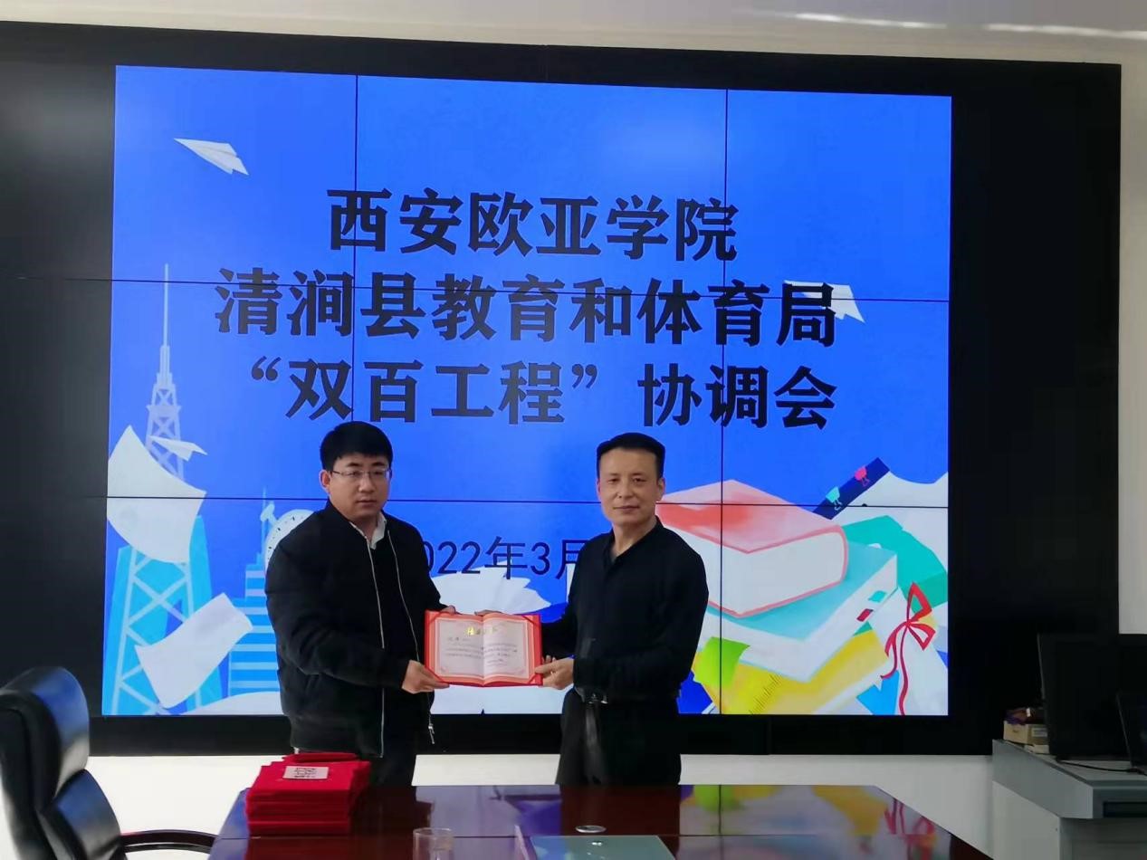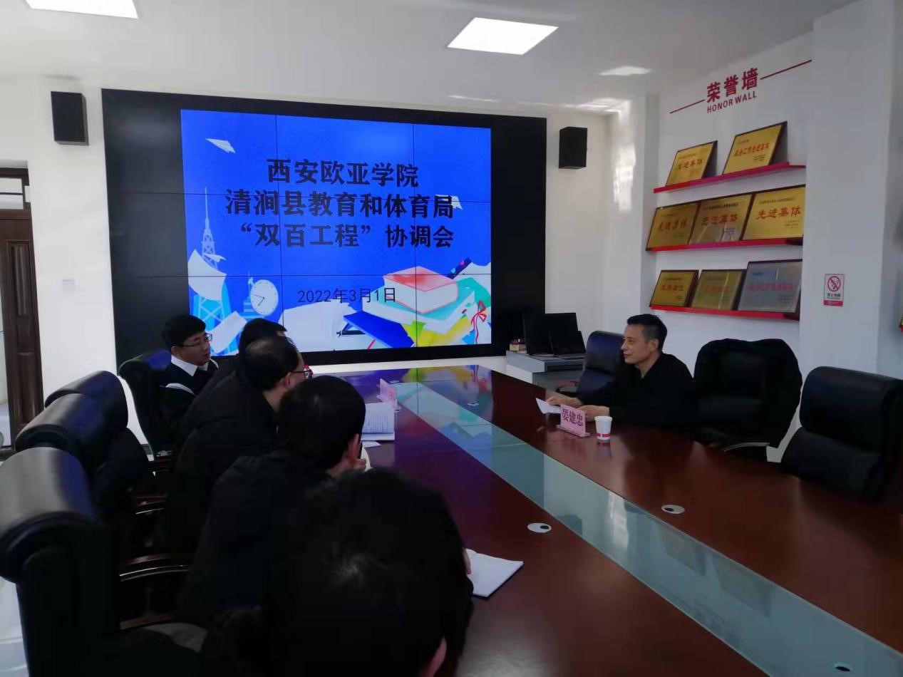 KY开元连续四年“双百工程“获得省级先进单位,为高质量落实好今年的工作任务,2022年3月1日,学校工会副主席晏建忠前往清涧县调研,召开了“双百工程”联席会,清涧县教体局惠东平局长、办公室主任和扶贫办公室郝股长参加了联席会,会议达成了以下共识:一是双方围绕智力帮扶、教育帮扶、人才帮扶和科技帮扶内容进行了交流,在继续做好名师培训班、班主任培训班、青年教师培训班的基础上,积极探索思政课教师培训班,并成为教育帮扶的固定项目;二是清涧县教体局加强科研帮扶协调力度,指定专人协调负责“双百工程”科研工作,力争2022年有新的突破;三是发挥学校艺术教育资源优势,探索清涧县中小学环境育人路径,在教育帮扶上有新的突破;四是通报了学前教育大专定制班实施中存在的困难,希望县教体局加大协调力度,确保高质量完成定制班学员学习任务。
