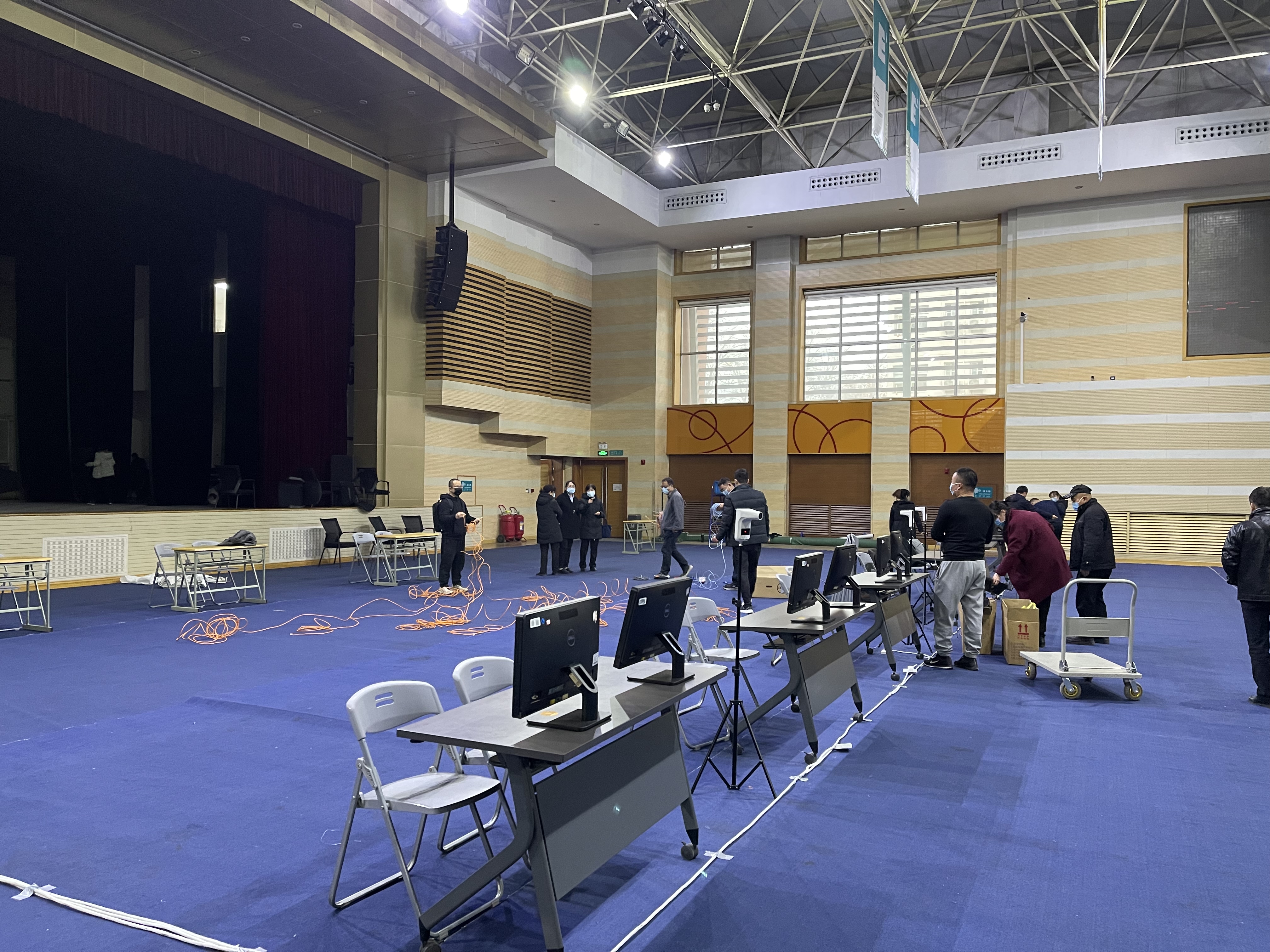 时间紧、任务重。为保障此项工作顺利开展,后勤集团立即组织人员,集团管理层亲临现场,带队开展现场布设工作。搬桌椅、铺线路、接设备……全力保障全员核酸检测工作顺利开展!