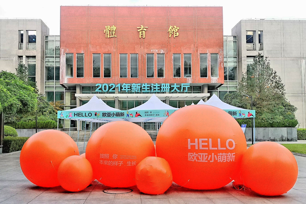 体育馆新生注册大厅前的鲜橙色“Hello,小萌新”欢迎气球,彰显青春与活力,跳跃着对未来的期待。