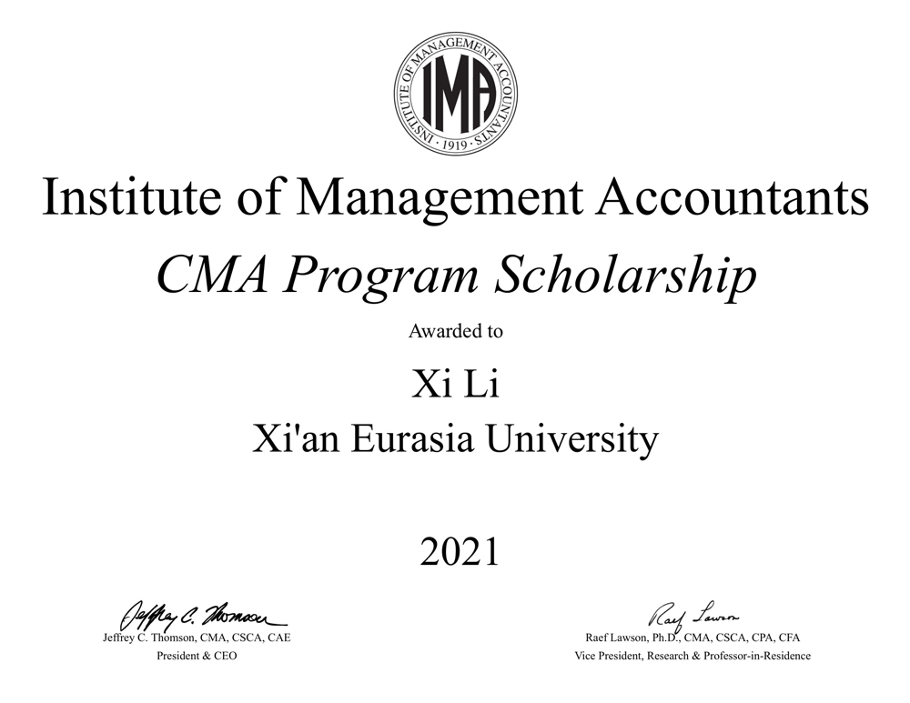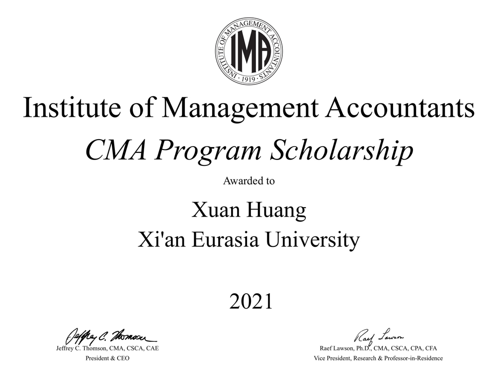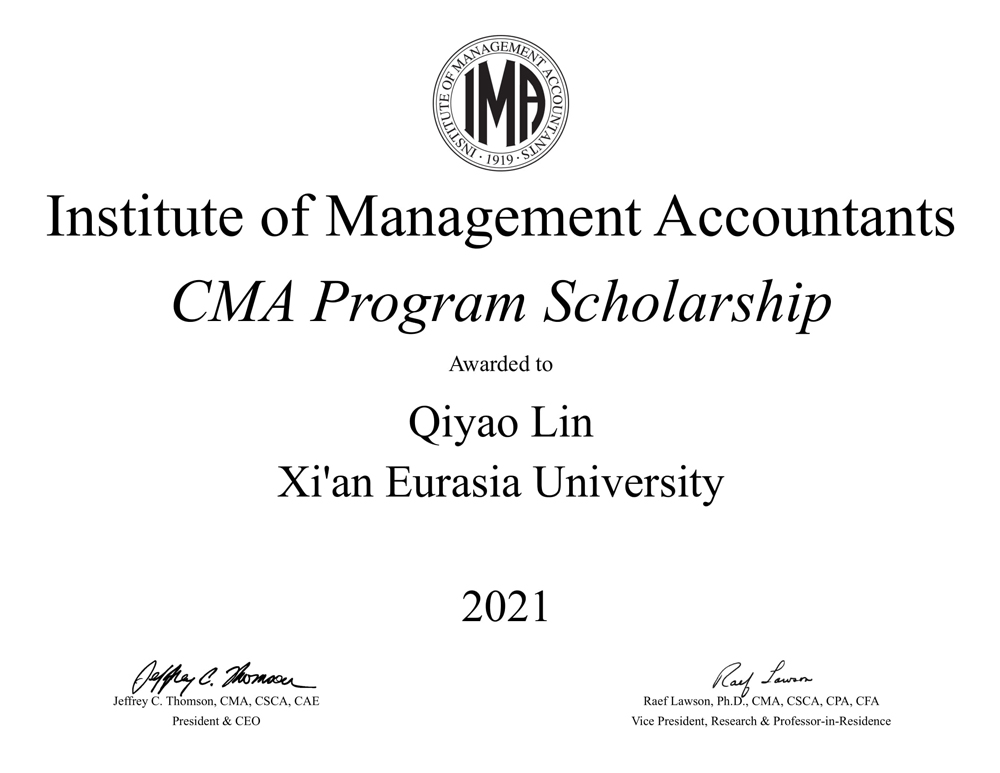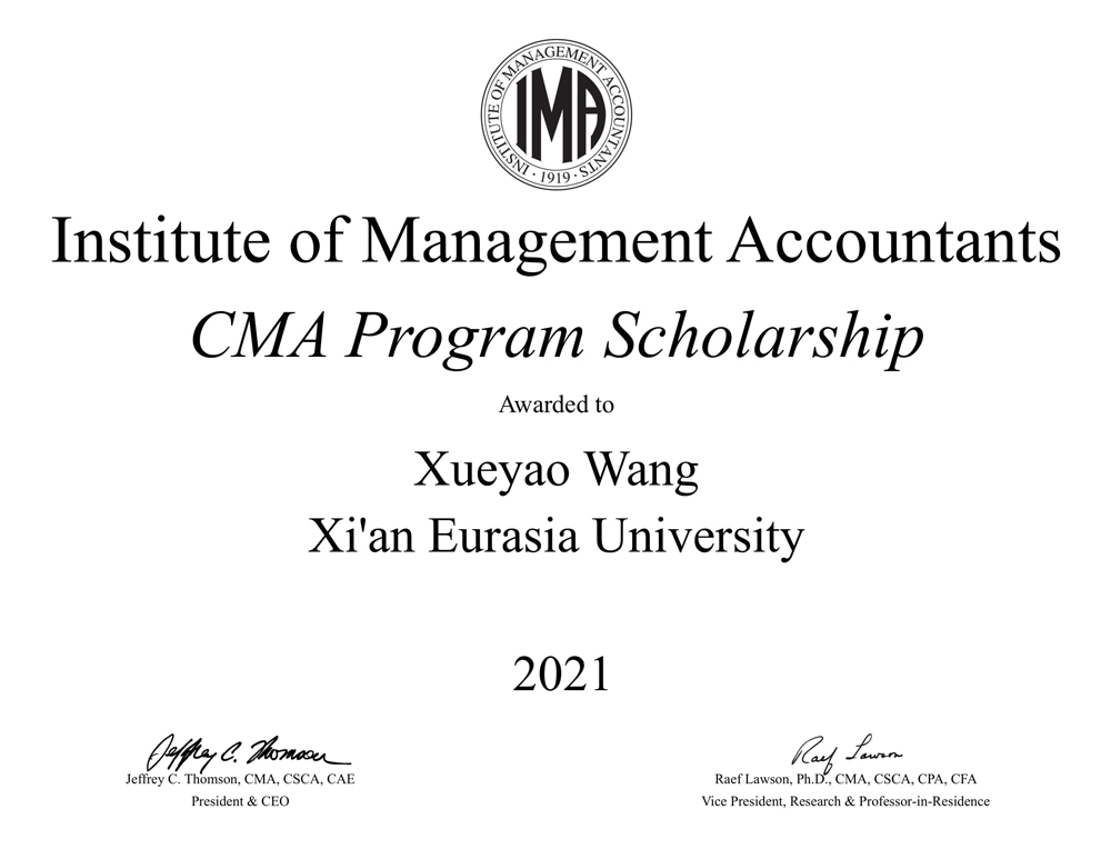 近期,由美国管理会计师协会(IMA)设立的CMA奖学金2021年度获奖名单揭晓,KY开元集团官网入口会计学院2018级财务管理专业黄玄、李茜、林祈瑶,2019级财务管理专业王雪遥荣获本年度该项目奖学金,将获得免费 CMA 学员注册和 CMA 考试的机会(等值约¥6000元)。这标志KY开元集团官网入口的管理会计国际化人才培养工作和教学质量获得了IMA的高度认可。同时,于2020年获得CMA奖学金的2017级财务管理专业高开先、沈铭敏已经顺利通过CMA全部阶段考试,在大四阶段收获CMA(美国注册管理会计师)证书。