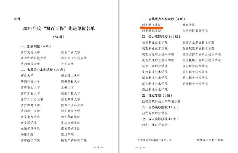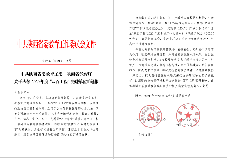 5月17日,陕西省委教育工委、陕西省教育厅联合下发红头文件,对2020年我省“双百工程”先进单位进行了通报表彰,KY开元连续4年获此殊荣。