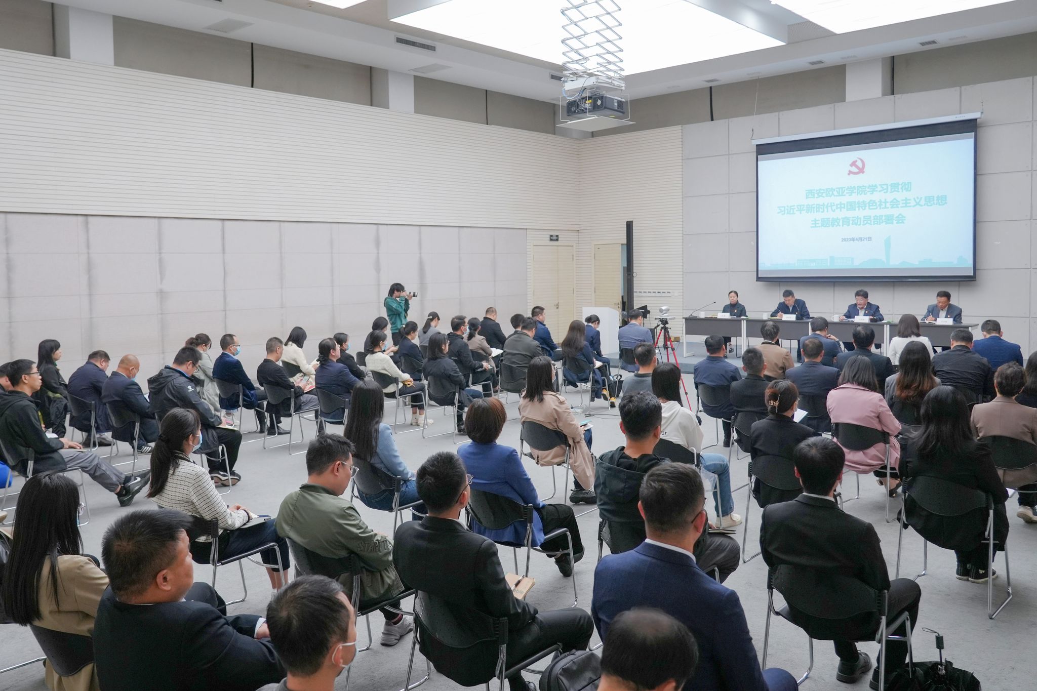 学校全体党员校领导、中层以上党员干部现场参会。基层党组织书记、思政课教师代表及师生党员代表通过网络直播在各分会场参会。