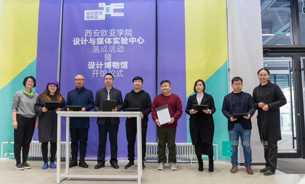 落成仪式上,欧亚学院与连联设计集团、森创空间、瑞亚设计、青筑创意、陕西双瑞图文设计有限公司、西安乐格电子科技有限公司、陕西西影数码传媒科技有限责任公司等7家公司签约。未来,这些入驻企业将在设计与媒体实验中心利用开放性的空间,开展全流程的校企合作,此举意在消解校园与社会之间的围墙,推动欧亚专业与社会产业的密切结合,使设计教育更具现实意义。