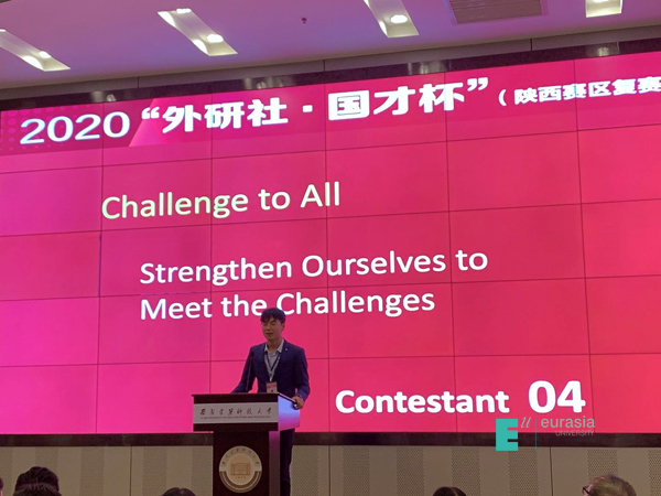 面对来自各个高校的竞争对手,“欧亚战队”的同学们沉着自信。写作组的曹璐涵同学写作功底扎实,内容紧扣主题、逻辑性强、语言流畅。演讲组的袁昊晟同学在舞台上语调抑扬顿挫,收放自如,自信笃定。