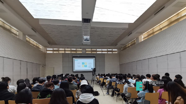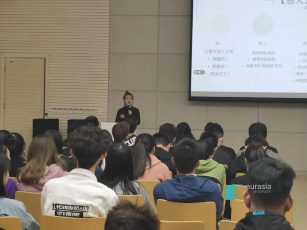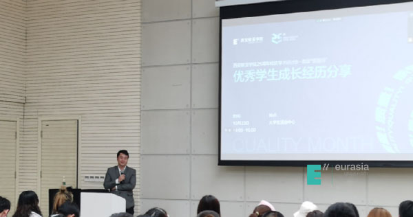 张成助理在致辞中提到,学校一直践行“以学生为中心”的教育教学理念,持续为同学们提供高质量的教育服务。学校目前已与500多家知名企业建立了深度合作关系,给学生提供更多机会参与到真实项目的教学实践活动,帮助同学实现高质量实习实践;引入100多位名海外知名大学毕业生加盟欧亚教师团队,与国际知名大学的客座教授共同完成线上线下的专业课程设计与讲授,让同学们不出国门也能接受高质量的国际化教育。学校每年有很多优秀毕业生,今年质量月活动,特别邀请了名企就业、国际名校录取、竞赛获奖的校友和学长进行分享,希望大家向优秀的学长学姐学习,合理规划自己的大学生活。