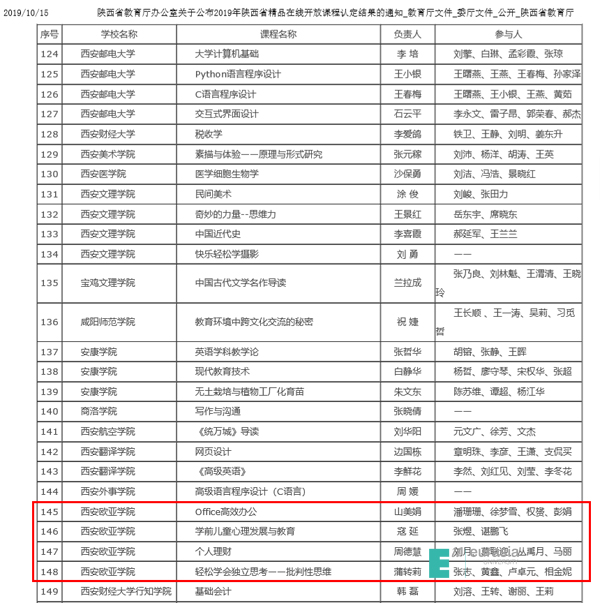 近日,认定结果在陕西省教育厅官网公布,KY开元推荐的4门课程均被认定为“2019年陕西省精品在线开放课程”,认定率100%,亦为同类院校认定数量最多的院校。