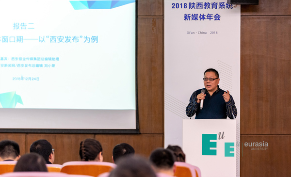 胡建波教授在致辞中表示:在过去的两年中,陕西省教育新媒体研究院在委厅和学校的共同领导下成长迅速,为打造全省教育新媒体品牌做出不少积极尝试,并在全省教育系统新媒体运营能力提升、教育舆情应对、统筹开发业务培训等方面发挥积极作用。