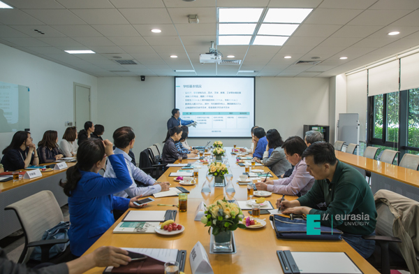 随后,专家们听取了胡建波董事长及校长助理王艳、文化传媒学院院长闫晋英、人居环境学院院长殷颖迪组成汇报团队的报告,分别为“欧亚教学改革探索与实践”、“欧亚对大商科人才培养的思考”、“文化传媒学院关于应用型人才培养实践”及“人居环境学院教育空间设计理念”。 同时,胡建波董事长也向专家抛出了他个人即欧亚面临的五个方面思考与困惑,办学定位:应用型办学定位与攀爬卡耐基阶梯;师资队伍:行业师资、优秀硕士与博士,专兼职教师比重;科学研究:社会服务、应用课题与纵向科研;办学条件:校园精致度、适应性和建设规模;经费分配:人工、日常教学与运营、建设。