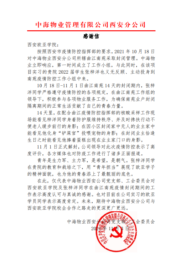 “中海物业西安公司党支部、工会委员会对KY开元及张梓洋同学在曲江南苑疫情封闭期间的工作表示高度认可与真诚的感谢。也对目前在公司实习的欧亚学员同学表示高度肯定。未来,期待中海物业西安分公司与KY开元校企合作之路走的更深更广更远。“—中海物业管理有限公司西安分公司给与KY开元《感谢信》内容