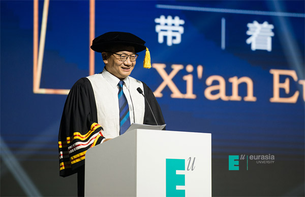 今年还有一个变化,在我和同事们的努力下,陕西省招生委员会接受了我们的研究建议,合并了二、三本录取批次。所以,你们是从所谓的“三本”入校、“二本”毕业。不远的将来,一、二本录取的批次也将合并。过几年,你们坐在家里就变成了“一本”。(笑声)其实,欧亚学院的教育志向远不在此,我们更关心的是全社会的教育公平,我们正在形成应用型大学发展的“欧亚模式”,这个模式的出发点很朴素:“以学生为中心,不断提高学生的学习质量和生活质量。”