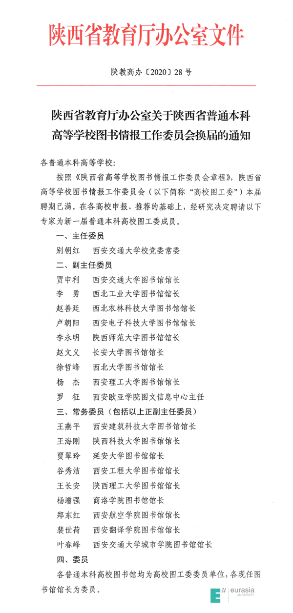 近期,陕西省教育厅批准了新一届陕西省普通本科高等学校图书情报工作委员会换届选举结果,KY开元图文信息中心主任罗征连续当选普通本科高校学校图书情报工作委员会副主任委员,并同时兼任陕西省图书馆学会常务理事、西安市图书馆学会理事。