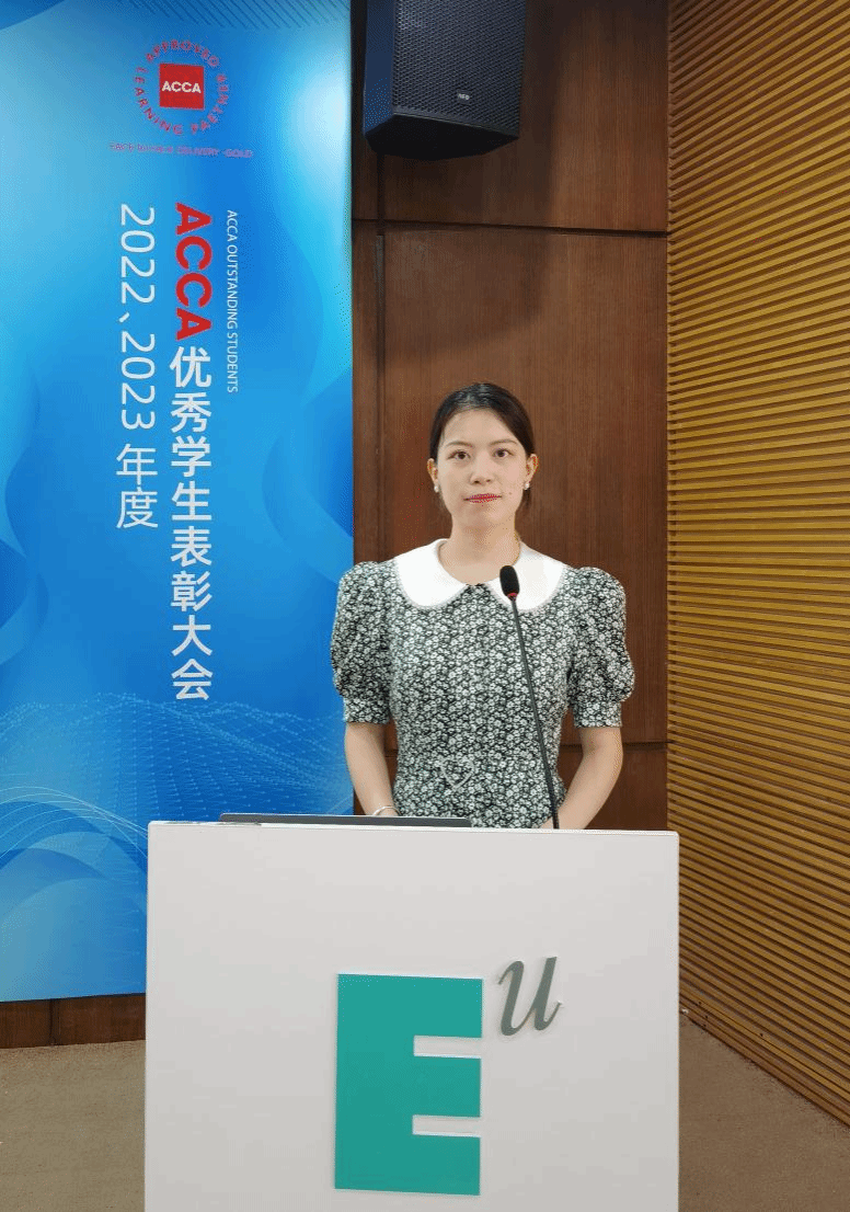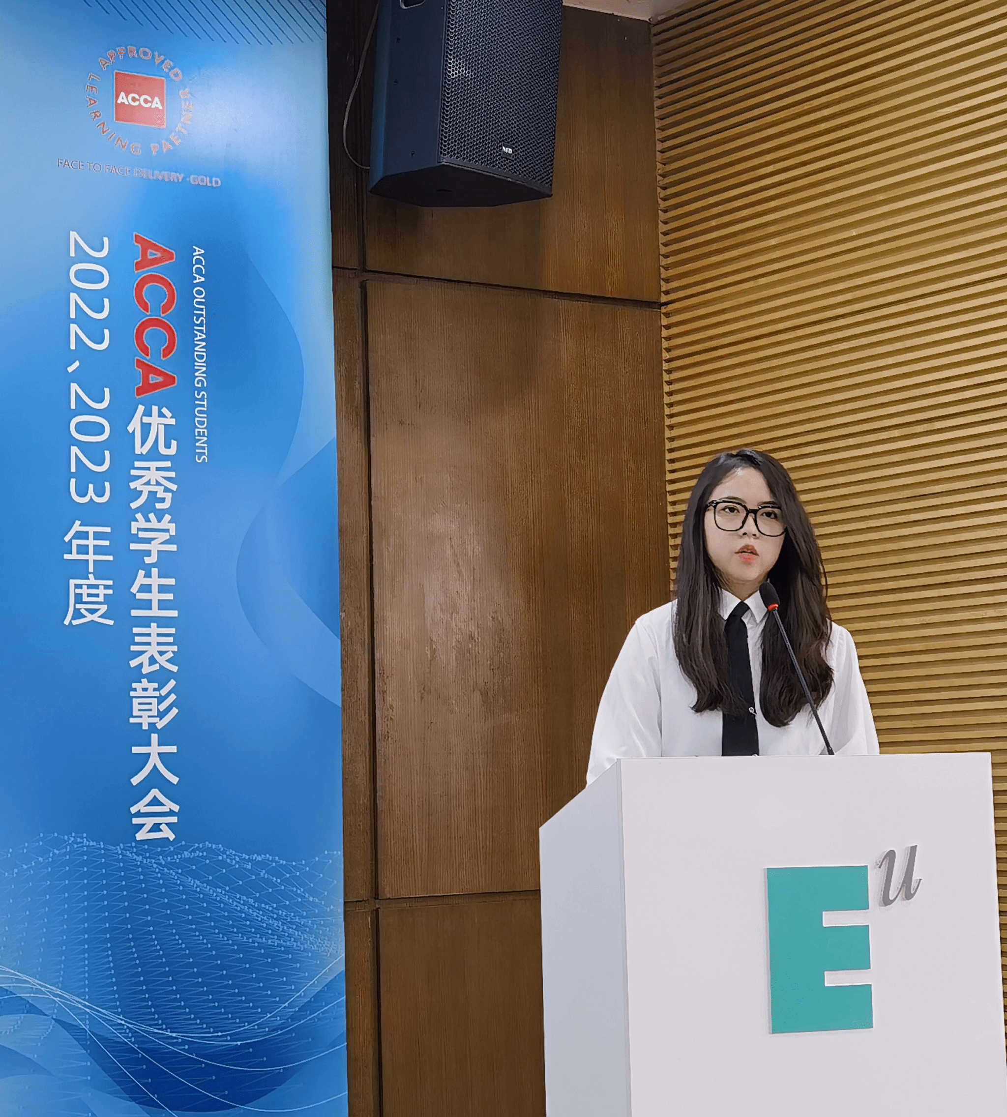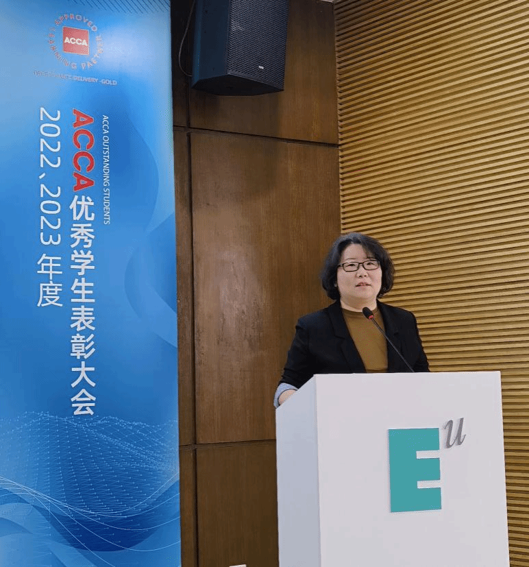 ACCA优秀学生代表任如月发言:回顾总结了她在ACCA专业学习过程中顺利通过五门ACCA全球考试的经验。她认为,个人的坚持不懈是确定成功的保障,清晰的学习目标、良好的学习习惯,以及合理的学习规划,都是奠定成功的基石。同时,在学习过程中来自老师们的专业教学和助教老师的辅导与帮助更是在成功道路上不可或缺的要素。无论是ACCA中心教师团队的外教还是国内教师,都在专业引导与知识教导方面对大家予以充分、及时的帮助。怀揣着感恩,任如月同学对ACCA中心教学团队的贺鸣、罗曼珊、张超洁老师表达了充分感谢,感谢她们在学习辅导与未来规划对她的帮助。并代表全体同学对ACCA中心主任吴晓光教授表达感谢,感谢吴晓光教授不仅为同学们组建了学习上强大优秀的教师团队与资源平台,更为同学们贯通了实践上丰富多元的实习机会。