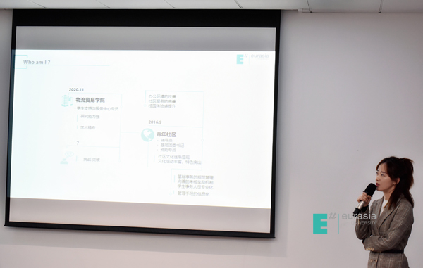 在沙龙上第一位分享的老师是来自孔子青年社区的辅导员王焱。她从新员工的角度谈了辅导员工作“24小时全天候”“365天全力以赴”对她意识上带来的冲击,以及自己是如何调整面对的。王焱老师说:“经过了一系列看似不可能完成的任务,我确认我在欧亚遇见了全新的自己,感谢这一段富有挑战的旅程。”