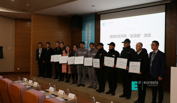 2020年是学校价值观启动第二年,学校将启动教职工福利计划2.0版,提升学校对教职工的人文关怀,系统关注教职工健康、子女成长、安居工程,让全体教职工感受教育的美好,感受欧亚的温暖。1月10日下午,值此新春佳节即将来临之际,学校领导心系学校困难教职工,组织开展了送温暖春节慰问活动。校党委书记于孟晨及副校长、工会主席张军宏代表学校,按照“1+1”补助标准,为12名困难教职工送去3000元春节慰问金,送上省教科文卫体工会和学校对贫困教职工的关怀与问候。