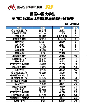在RBM3KM竞赛项目中,赵宇骅以2分25秒的成绩获得全国第二名,郑宇鹏同学以3分39秒的成绩位列全国第二十九名。
