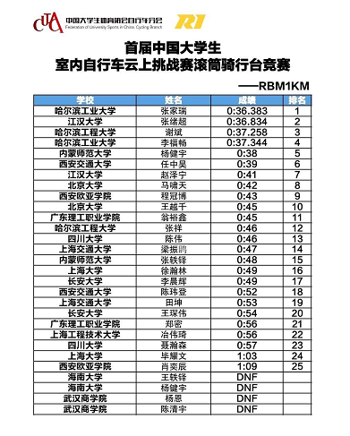 RBM1KM的竞赛项目中,程冠博同学以43秒的成绩位列全国第九名;肖奕辰同学以1分零9秒的成绩位列全国第二十五名。
