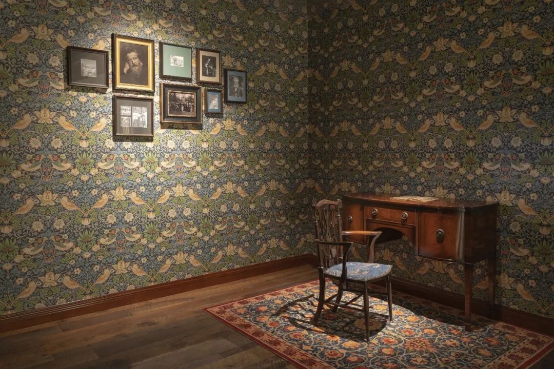 莫里斯场景角以其经典壁纸设计《草莓小偷》为背景,通过仿古桌椅、莫里斯家族影像还原19世纪的房屋一隅,让观众沉浸式感受19世纪设计的卓越风采。