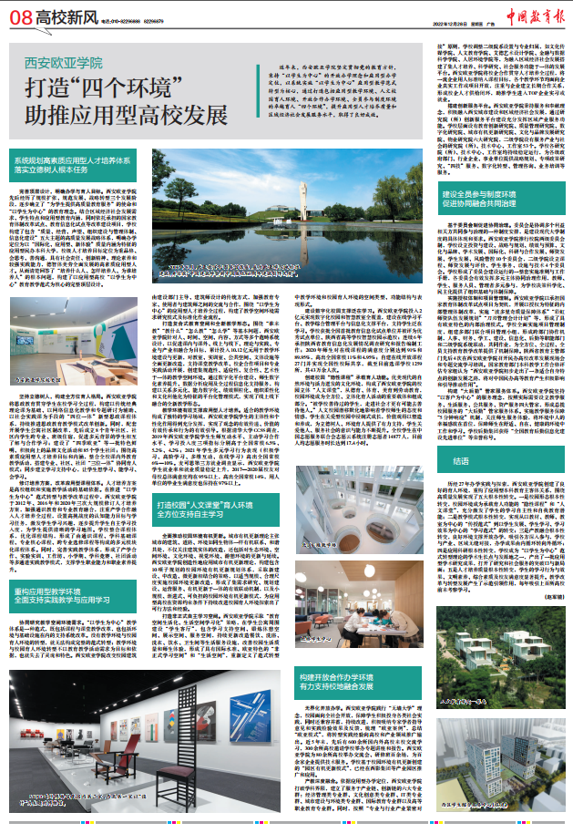 历经27年办学实践与探索,西安欧亚创建了良好的育人环境,重构了应用型本科教育主客体关系,围绕高质量发展实现了五大根本性转变。一是校园形态根本性转变,校园环境成为承载育人功能的“隐性课程”和“人文课堂”,充分激发了学生学习自主性和自我教育潜能;二是教学模式根本性转变,实现从以教材、教师、教室为中心的“传授范式”到以学生发展、学生学习、学习效果为中心的“学习范式”的转变;三是产教融合根本性转变,良好环境支撑开放办学,吸引各方深入参与,学校与产业、区域无缝对接,办学成果由内循环转向外循环;四是应用科研根本性转变,学校成为“以学生为中心”范式转型理论的学术生长点与发源地之一,产出了一批应用型学术研究成果,打开了研究和社会服务的突破口与新局面;五是人才培养质量根本性转变,学生的学习行为与效果、文明素养、综合素质及校友满意度显著提升。教学改革与转型发展产生了示范引领作用,每年吸引上百所高校前来考察学习。