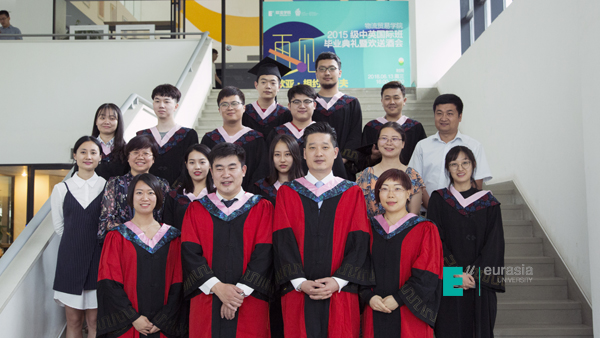 毕业典礼中,英国卡迪夫城市大学中国办公室首席代表李斌老师代表英方向各位领导,学生及家长致毕业辞。英国大学与学院共计 180 多所,在过往的 153 年发展历史长河里,作为英国传统与现代相互集合的大学,李斌老师相信在中英高等教育发展与交流中的价值与其体现,已经在过往的五年中,在欧亚学院物流贸易学院中英国际班中淋漓尽致的体现出来。今天,中英两校为中英两国高等教育及优秀人才培养设计了适合中国高等院校发展、适合中国学生快速成长的渠道。李斌老师表示卡迪夫校方愿意以永不懈怠的精神状态和一往无前的奋斗姿态,继续朝着实现双方高等教育国际化2.0版本的宏伟目标奋勇前进。