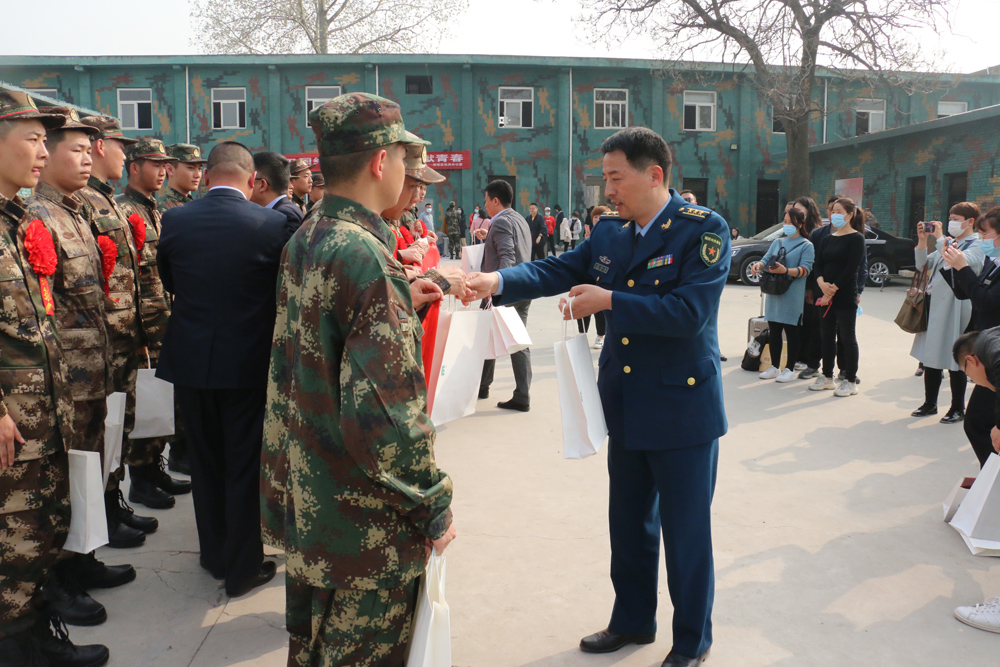 新兵们得知学校领导看望大家,早早的整装列队,身穿戎装,胸前佩戴大红花,充满着青春的朝气,用最热情和最幸福的微笑迎接学校领导一行的到来。