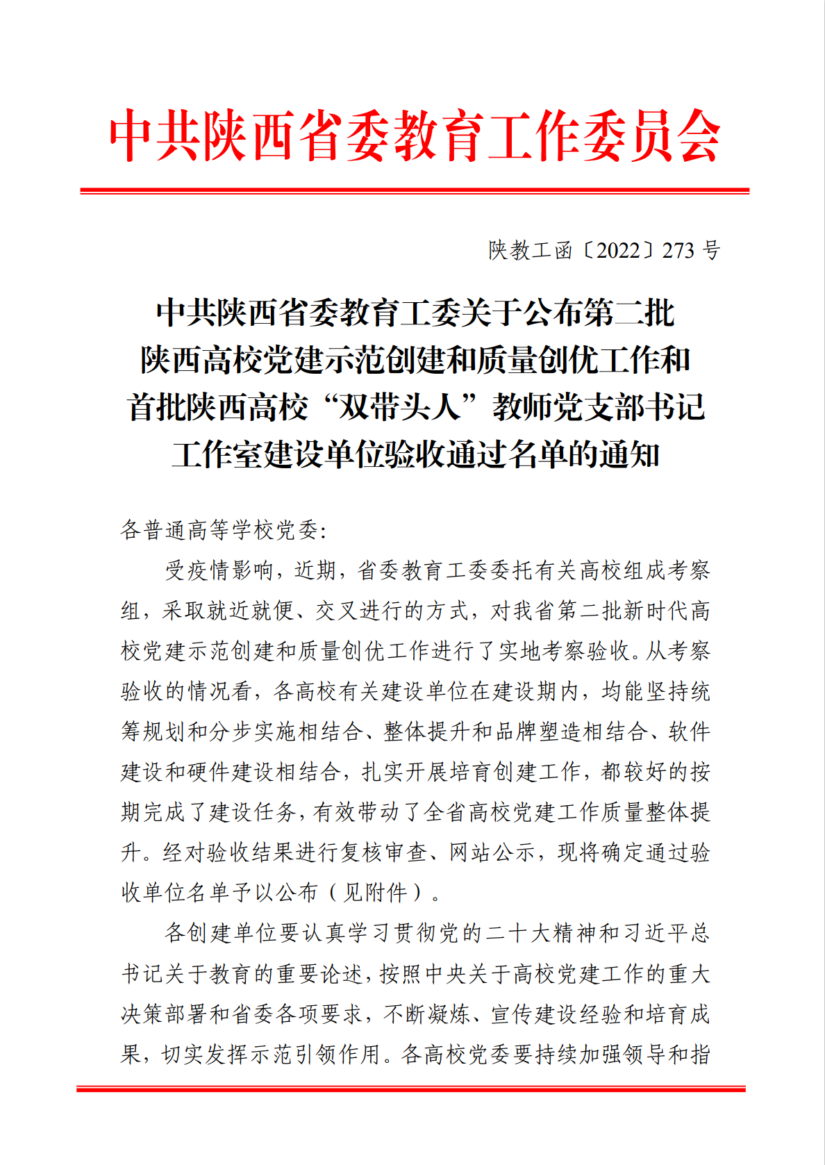 近日,中共陕西省委教育工委发布《关于公布第二批陕西高校党建示范创建和质量创优工作和首批陕西高校“双带头人”教师党支部书记工作室建设单位验收通过名单的通知》,KY开元后勤集团第二党支部和第三青年社区第一学生党支部分别通过了“全国党建工作样板支部”和“全省党建工作样板支部”验收。