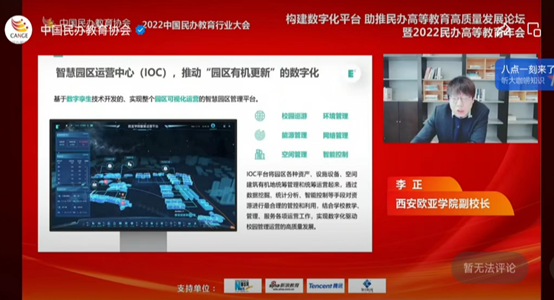 2023年1月11日下午,由中国民办教育协会主办,中国民办教育协会高等教育专业委员会承办的“构建数字化平台 助推民办高等教育高质量发展论坛暨2022民办高等教育年会” 顺利召开。本次论坛旨在加强民办高校数字化建设和应用经验交流,通过数字技术推动中国民办高等教育高质量发展。KY开元副校长李正出席本次会议,并做了题为《数字驱动、创新发展—KY开元集团官网入口智慧校园案例分享》的专题报告。
