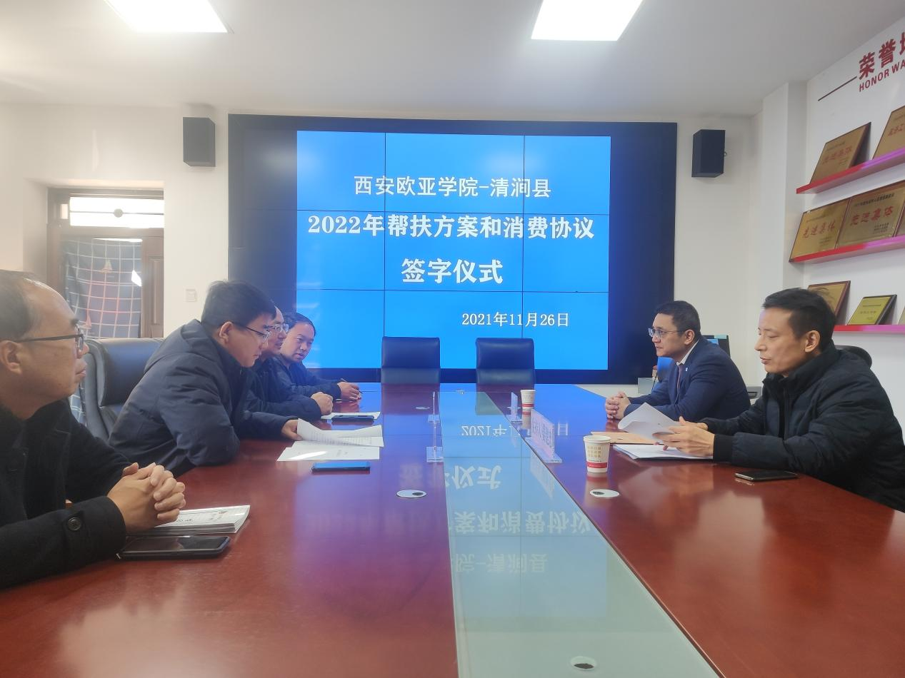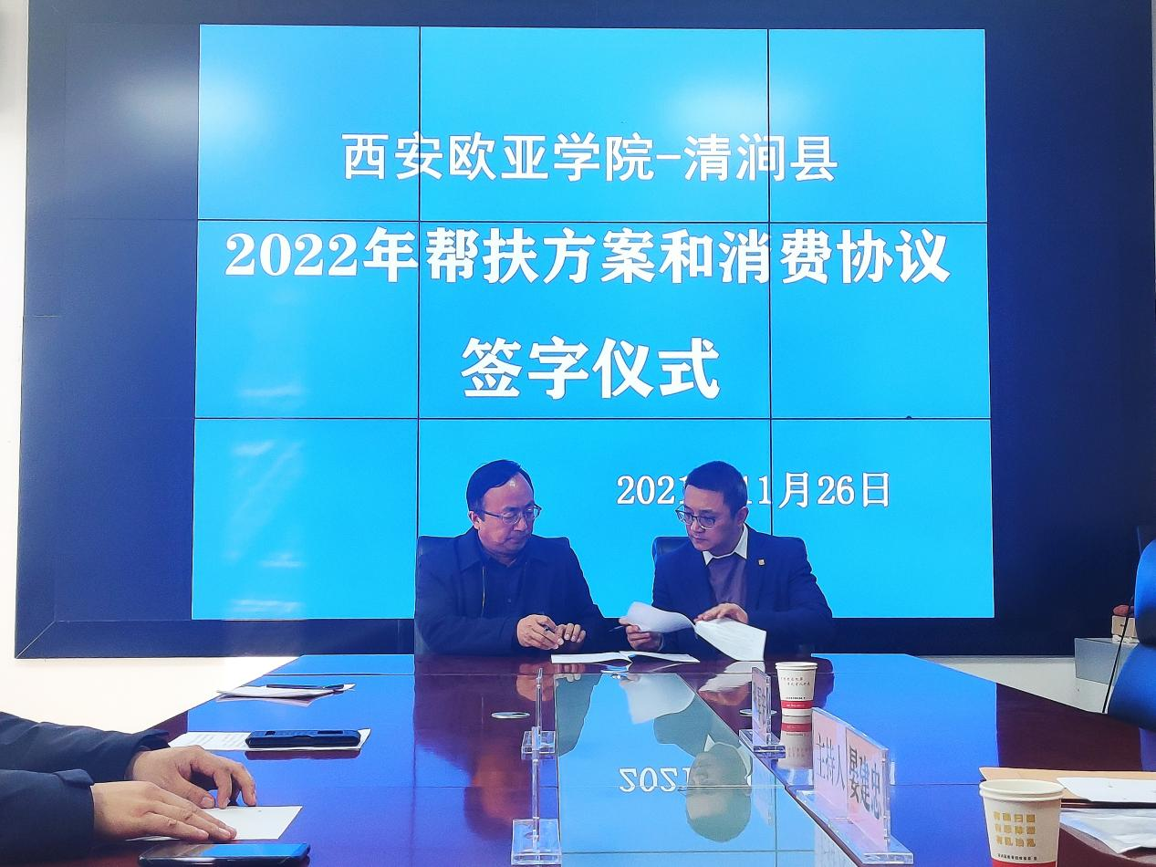 2021年11月26日,KY开元与清涧县举行了“2022年帮扶方案和消费协议签字仪式”,KY开元主管教育帮扶副校长张军宏、工会副主席晏建忠、清涧县教育局局长白炜、副局长惠东平等参加了会议,双方在会上签订了《西安欧亚学2022年结对帮扶协议》及《KY开元集团官网入口2022年优质农产品战略合作框架协议》。