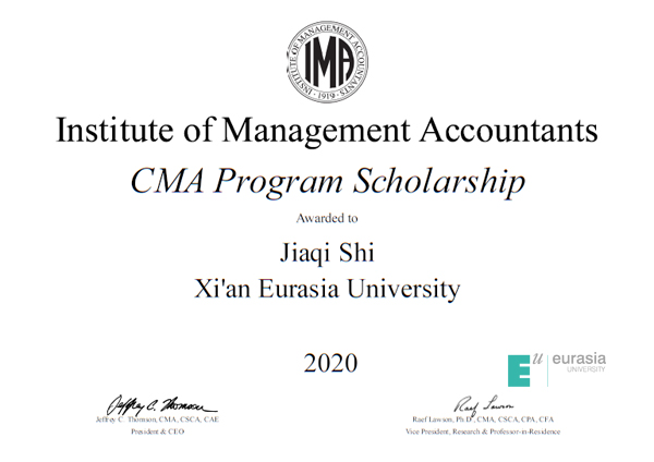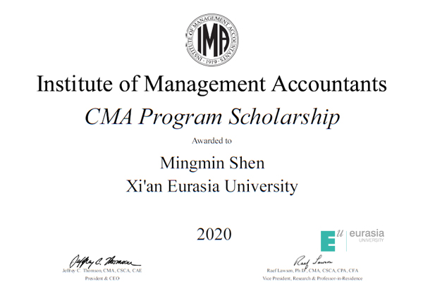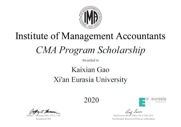 日前,由美国管理会计师协会(IMA)设立的CMA奖学金2020年度获奖名单揭晓,KY开元会计学院2017级财务管理专业高开先、石佳祺、沈铭敏荣获本年度该项目奖学金,将获得免费 CMA 学员注册和 CMA 考试的机会(等值约¥6000元)。这标志KY开元的管理会计国际化人才培养工作和教学质量获得了IMA的高度认可。