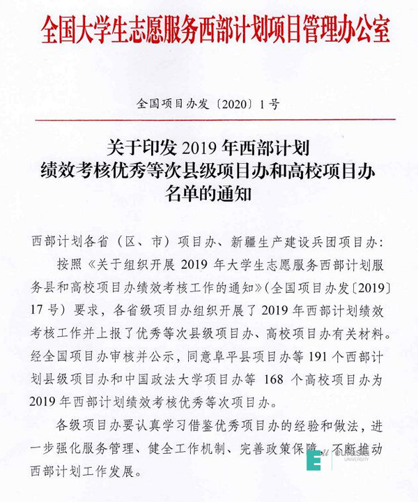 近日,共青团中央全国大学生志愿服务西部计划项目管理办公室公布了高校项目办绩效考核工作结果。经全国项目办评审和公示,KY开元西部计划项目办(校团委)与陕西省9所高校共同获评“2019年全国大学生志愿服务西部计划优秀高校项目办”称号,这是KY开元第二次获此荣誉。