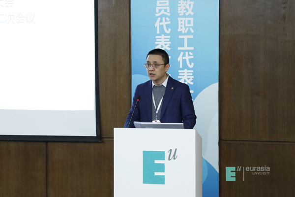 于孟晨书记致闭幕词,他高度肯定了上届工会工作取得的成绩,一是新一届“双代会”作用明显,通过教职工代表建言献策,推动了学校改革发展,维护了教职员工权益;二是校工会“娘家人”成效突出,在教职工子女入学、“欧二代”暑期项目和教职工大健康管理模式创新等方面成效显著;三是教职工文化活动特色鲜明,采取“俱乐部+教职工小家”模式,丰富教职员工文化生活;四是校工会助推发展成效显著,充分发挥工会“参与、维护、建设、教育”作用,有力推动事业发展,为学校赢得声誉。学校被陕西省总工会授予“全省厂务公开职代会五星级单位”荣誉称号。围绕“四个全面”战略布局,全力推进扶贫攻坚,学校再次获得省委教育工委、省教育厅授予的2018年度“双百工程”先进单位。希望本届工会在上级工会和学校党委的领导下,围绕学校新的十年发展战略,团结、引导全体教职工做出新的贡献。