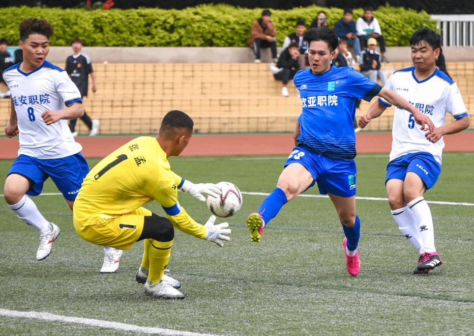 5月20日,KY开元集团官网入口队在1/4淘汰赛中迎战陕西警官职业学院队。比赛仅仅进行到16分钟,欧亚队就凭借王世龙和李辉的进球取得了2:0的领先,不过,由于当天天气炎热,比赛进入下半场后对手的体能优势逐渐体现出来,在短时间内就将比分扳成了2:2平。但队员们没有轻言放弃,而是互相鼓励,调整心态,在比赛的第87分钟,29号哈沙拉姆门前抢点,打进了杀死比赛的一球,最终KY开元集团官网入口队以3:2的比分险胜对手,闯入四强。