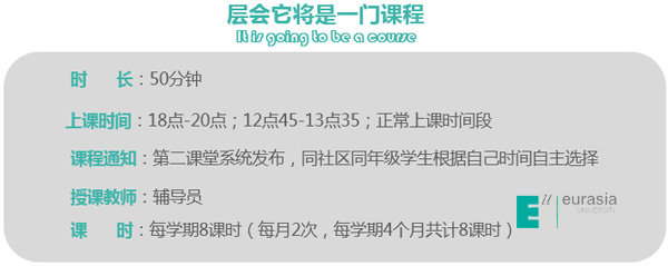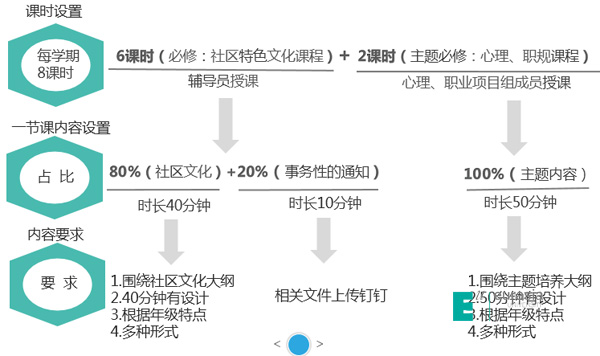 层会将成为一门课程,每节课时长50分钟,每学期8课时(6学时+2学时),6课时内容围绕校级人才培养目标嵌入社区文化,2课时内容围绕学生心理、职业规划以年级特点而设置,架构主要由社区文化(占时40分钟)和基础事务(占时10分钟)两部分组成。