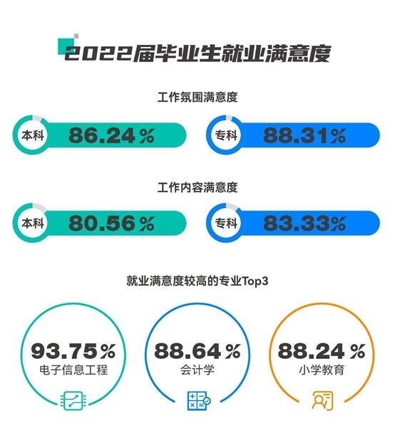 在就业满意度上,2022届本、专科毕业生均对自己的工作氛围、工作内容表示出较高的认可。其中,来自电子信息工程、会计学、小学教育专业的学生,就业满意度排名前三。