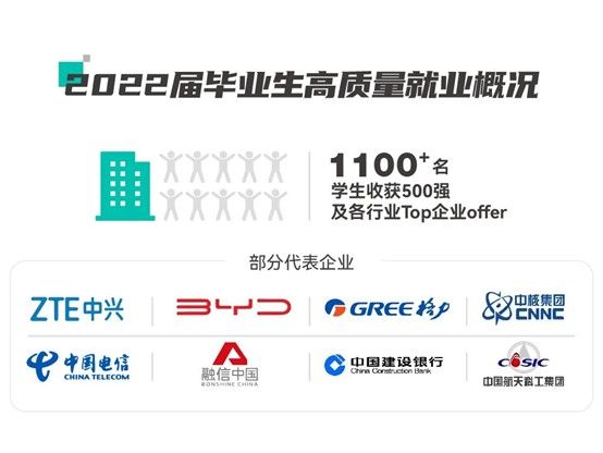 本届共有1151名学生进入各行业Top企业,162名毕业生入职500强企业,这其中包括中国电信集团公司、中国航天科工集团公司、中国核工业集团有限公司、珠海格力电器股份有限公司等众多知名企业,学生们表现出了较高的求职就业竞争力。