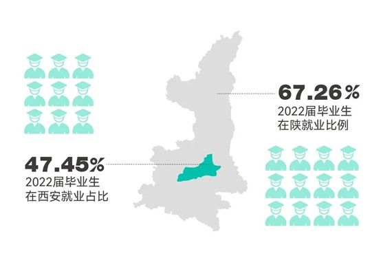 在就业地区上,67.26%的2022届毕业生选择在陕发展,西安成为就业占比最高的城市。