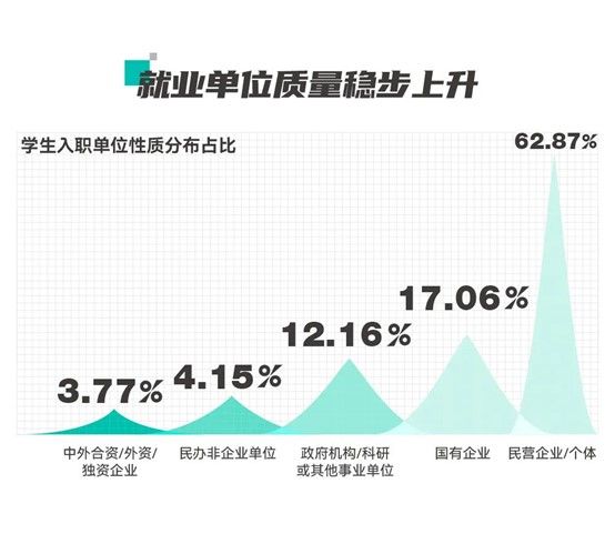 在就业单位性质上,2022届毕业生以民营企业/个体为主,同时纵观近几年数据报告发现,学生在入职国企、政府机构/科研或其他事业单位、民办非企业单位、中外合资/外资/独资企业的比重稳步上升,学生就业质量不断提升。