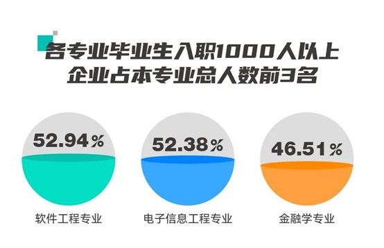各专业毕业生入职企业规模分布占比显示,软件工程、电子信息工程、金融学专业的学生在入职1000人以上的企业表现优异,三个专业近一半或一半以上的学生都能进入大型企业就职。