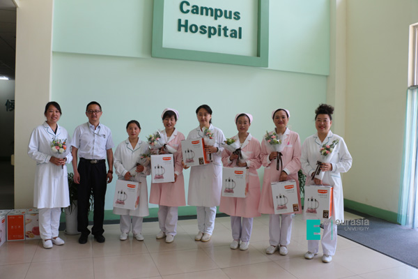 在第108个5月12日国际护士节到来之际,工会副主席晏建忠等工会人员及后勤集团领导,携带礼品慰问学校门诊部医护人员。